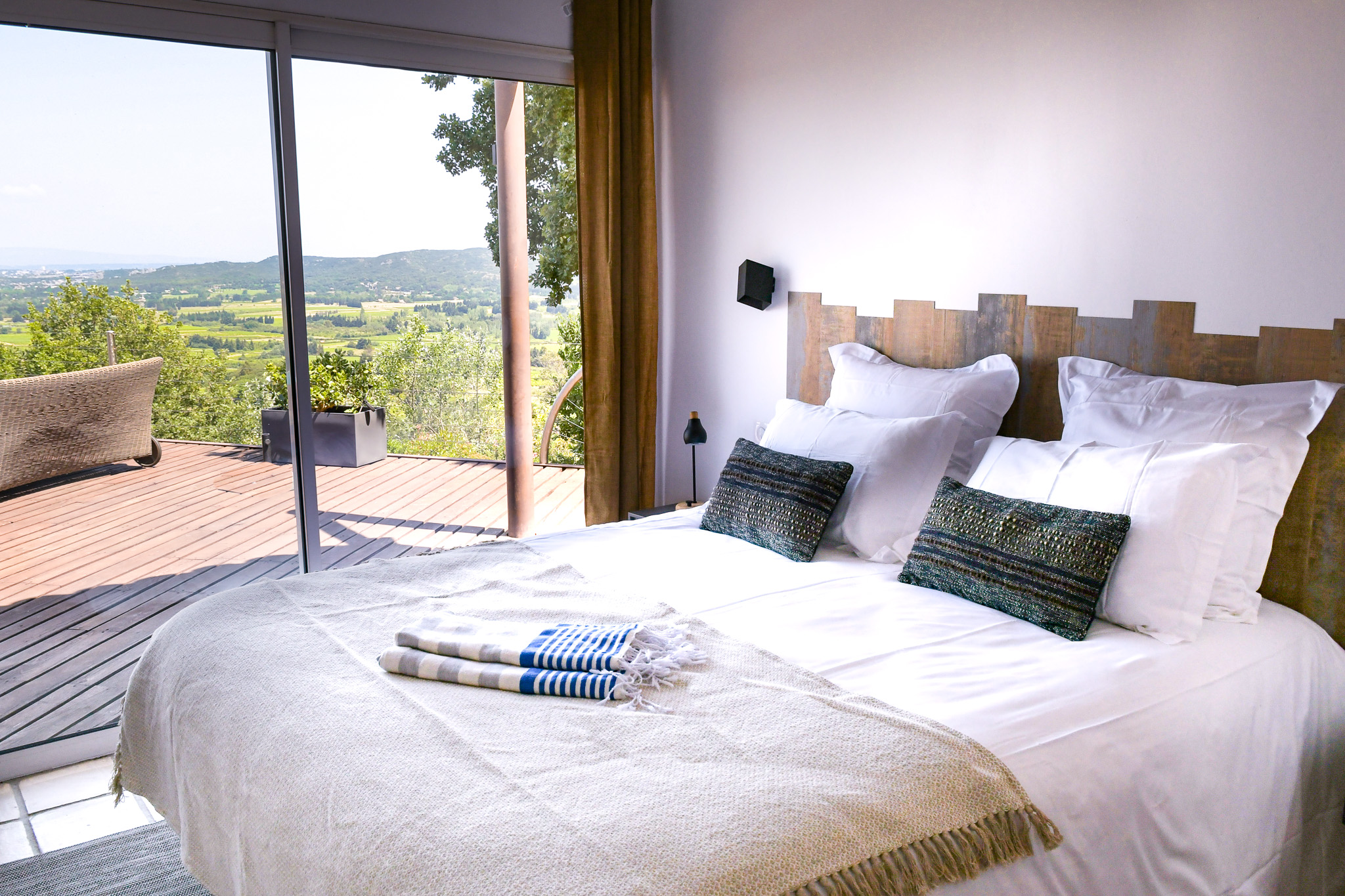 Parmi ses privilèges, la chambre Hanoï permet d’accéder directement à la terrasse, à la piscine et au jacuzzi. Aux premières lueurs du jour, elle vous permet de contempler les vignobles et les champs alentours, et une vue panoramique époustouflante allant du Mont Ventoux aux Alpilles.