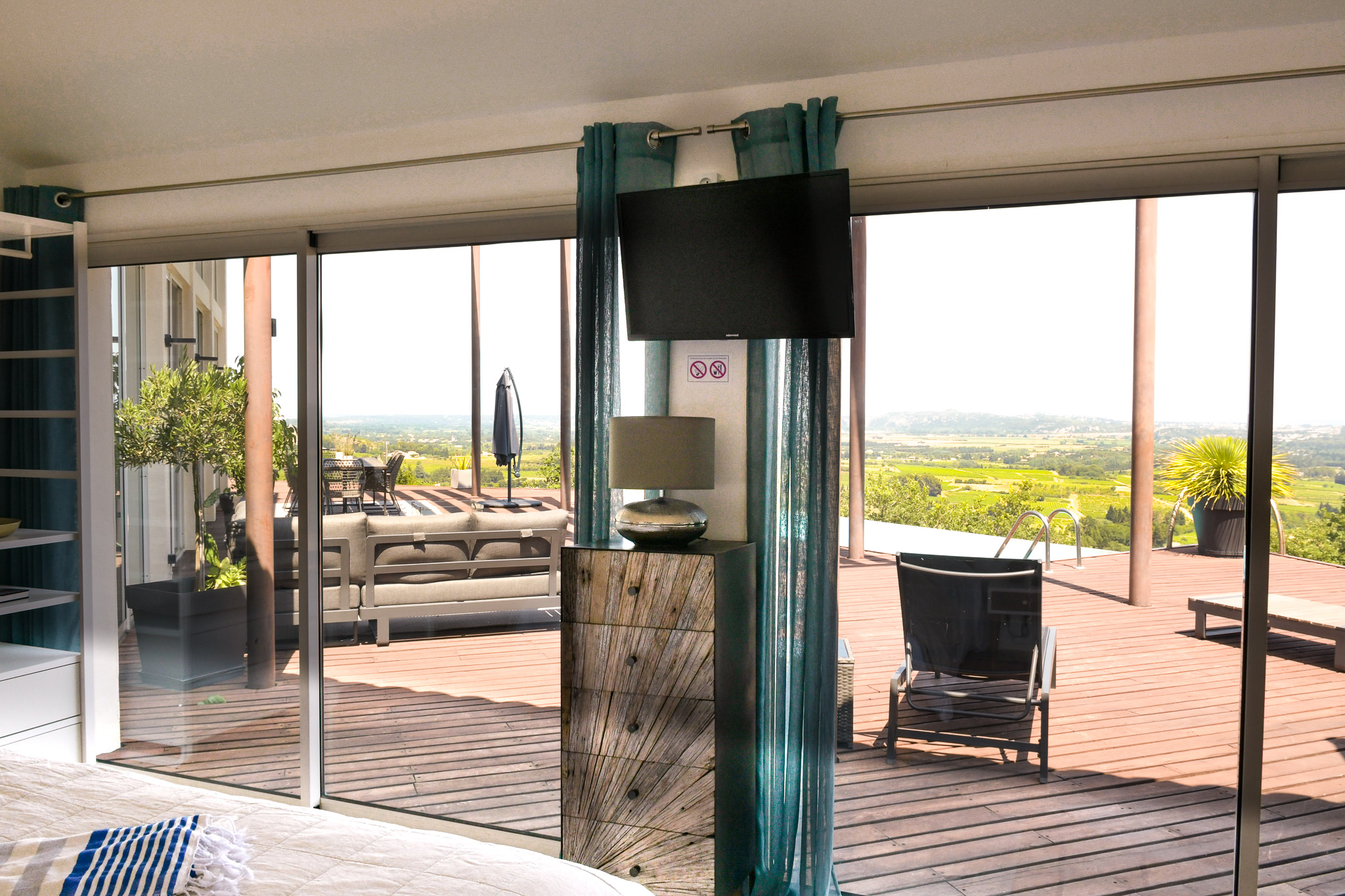 Parmi ses privilèges, la suite Saïgon permet d’accéder directement à la terrasse, à la piscine et au jacuzzi. Aux premières lueurs du jour, elle vous permet de contempler les vignobles et les champs alentours, et une vue panoramique époustouflante allant du Mont Ventoux aux Alpilles.